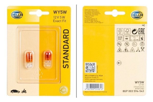 HELLA WY5W 12V 5W Лампа розжарювання вказівника повороту (жовтий) STANDARD (блістер 2 шт) BHS (Behr Hella Service) 8GP003594543