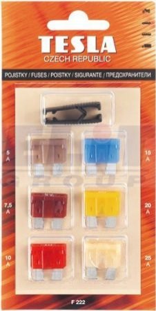Предохранитель Евро (к-т 6 шт. 5A, 7,5A, 10A, 15A, 20A, 25A) с пинцетом, бл. уп. Tesla f222