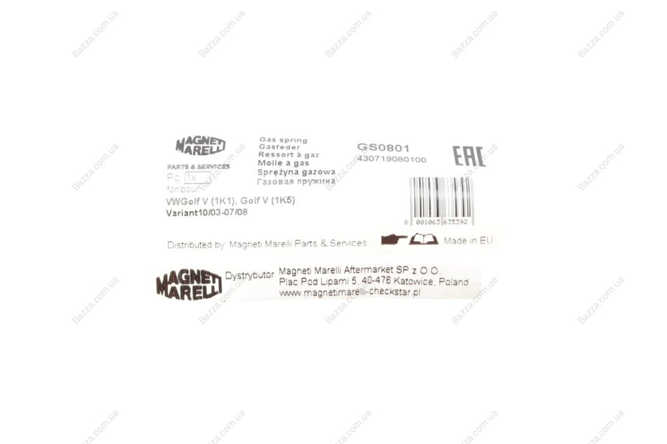 Амортизатор багажника VW Golf V (пр-во Magneti Marelli кор.код. GS0801) Magneti Marelli 430719080100