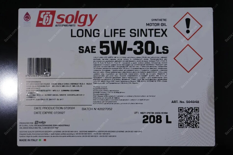 Олива моторна LONG LIFE SINTEX 5W-30 LS (208 L) Solgy 504048